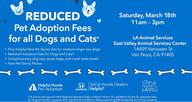 Los Angeles, March 16, 2023 –Bigger dogs are often challenged in finding a new home, so our friends at Helpful Honda will be helping medium and larger sized canine companions get adopted this Saturday, March 18, at our East Valley Animal Services Center from 11am to 3pm. Families who adopt a medium and/or larger-sized canine companion will be provided a new pet starter kit that includes a collar, leash, dog bed, toys, and food to help make it easier to welcome and bring home a new furry friend. We will also be hosting a second Helpful Honda Pet Adoption event at our Chesterfield Square/South LA Center next Saturday, March 25 from 11am to 3pm.