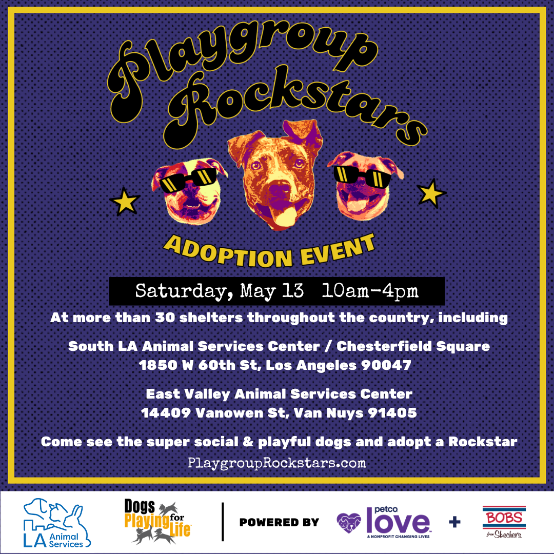 Los Angeles, May 10, 2023 – LA Animal Services will be hosting a Playgroup Rockstars Adoption Event at the Chesterfield Square/South LA shelter and the East Valley shelter this Saturday, May 13 from 10am to 4pm. Meet adoptable dogs who are ready for their new homes, and watch them run and play in the yards showing adopters their amazing personalities and skills! To encourage adoptions around the country, national nonprofit organization Petco Love joins Dogs Playing for Life and BOBS from Skechers launching a National Playgroup Rockstars Adoption event at more than 30 shelters around the country to show off the social, adoptable dogs in a fun and playful environment.