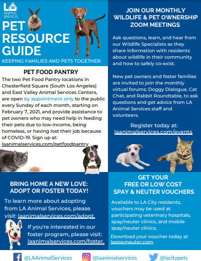 Los Angeles, January 28, 2021 – LA Animal Services has created the Pet Resource Guide and the Community Resource Guide to let Angelenos know of the available resources and programs available to LA City residents. The Pet Resource Guide provides information on programs and services available to pet owners and their furry family members; and the Community Resource Guide lists services and programs for the community from LA City-based organizations, from food distribution and housing resources to pet and people resources.