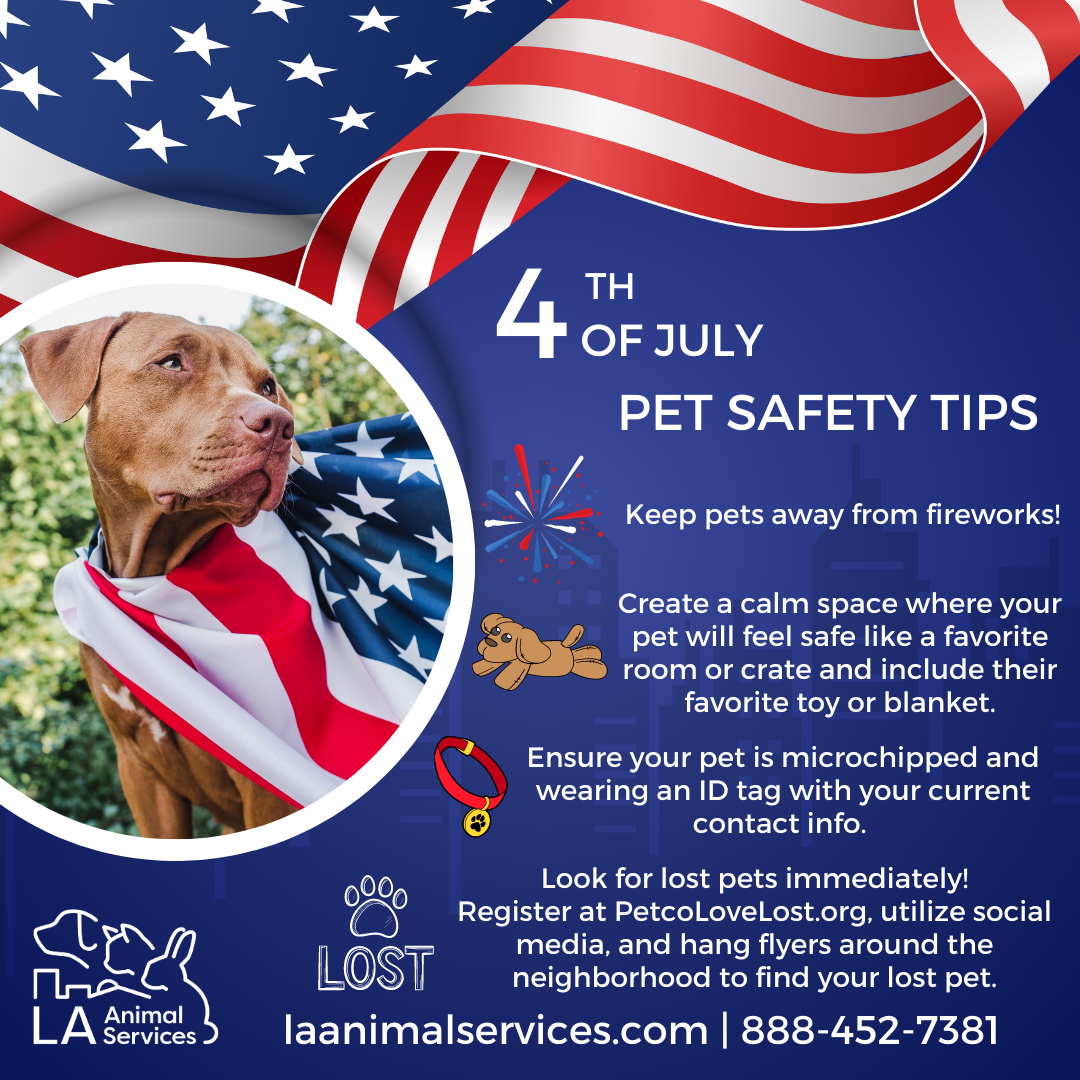 “As you plan and celebrate Independence Day, LA Animal Services would like to share the following pet safety tips to help keep you and your pets safe before, during and after the 4th of July festivities,” said Annette Ramirez, Interim General Manager for LA Animal Services.
