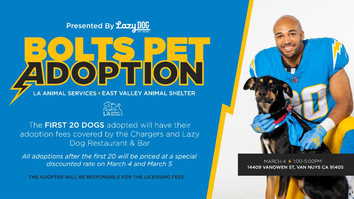 The ribbon cutting ceremony will culminate with an adoption event from 12:30-5pm where dog lovers will have a unique opportunity to provide a forever home for orphan pets. To commemorate the reopening, the Charger Impact Fund and Lazy Dog Restaurant & Bar will cover adoption fees (excluding licensing fees) for the first 20 dogs adopted at the East Valley location and gift a Chargers Care Kit to each new fur-parent.